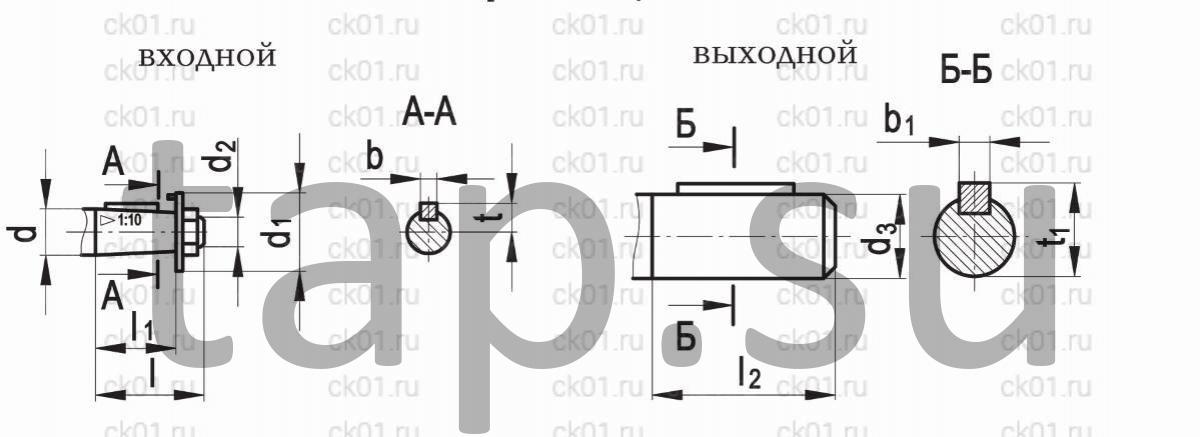| Типоразмер редуктора | d | d1 | d2 | l | l1 | b | t | d3 | l2 | b1 | t1 |