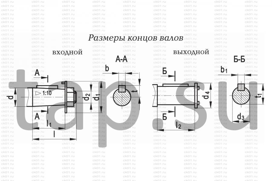 | Типоразмер редуктора | d | d1 | d2 | l | l1 | b | t | d3 | d4 | l2 | b1 | t1 |
